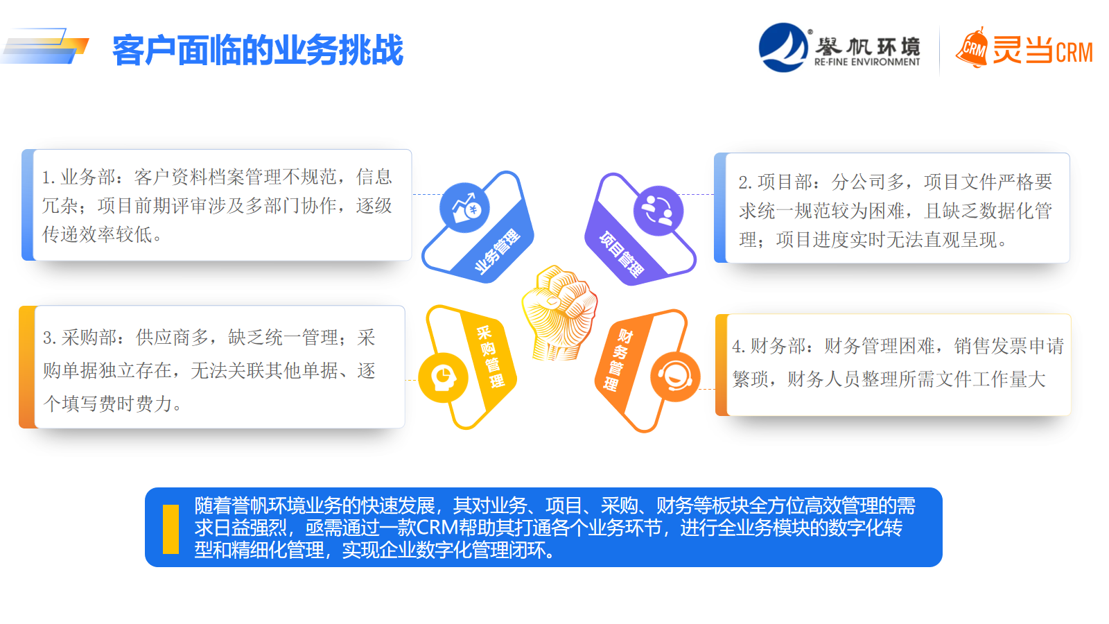 誉帆始终秉承着发展公司、实现自我、回报家人、回馈社会的企业愿景,把立足上海、辐射全国、业务精专、诚信共赢的理念作为经营发展的基本指导思想,将公司打造成“科技型、专家型、管理型”的企业。“誉帆”以崭新的姿态服务于社会,谋求“人才、品牌、管理、机制、技术“五大优势,实现”客户、社会、伙伴、员工、股东“五方满意。为市政工程的优质合作伙伴,誉帆环境一直在进行技术培训、工艺改进革新等工作,并参与多项教材、规范编制工作,但随着业务逐步拓展至全国,公司总部的管理难度与运营压力与日俱增,对内部管理的效率要求也越来越高。