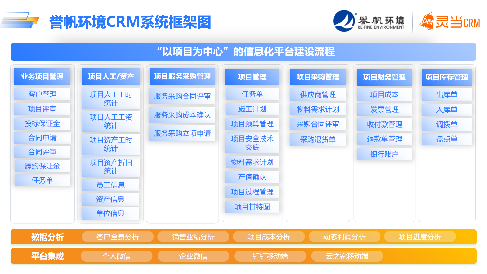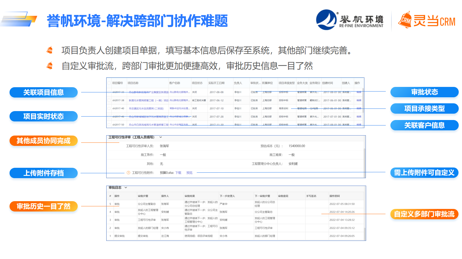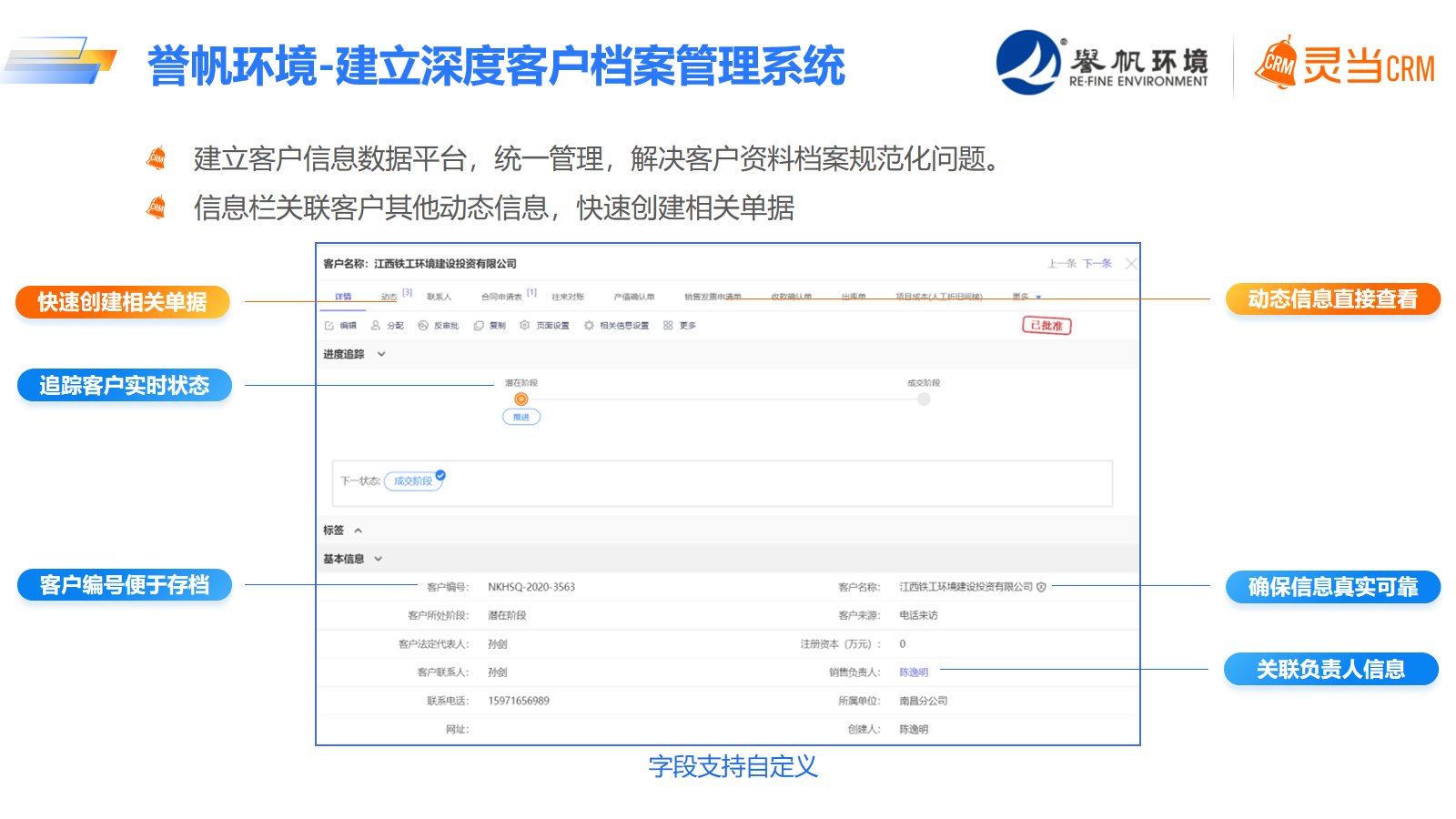 灵当CRM将誉帆环境多个部门和项目之间的信息流打通,实现了企业信息共享,有助于企业完成资源的合理调配与平衡。系统可将客户、合同、项目等信息永久留存,且将这些资料进行规范化管理,实现上下游单据完美衔接。通过数据的规范化管理,还能将各环节的人责权划分更清晰,打破传统企业部门人员冗余、责任不清的旧况,即使是人员离职,也能保证资料不丢失。