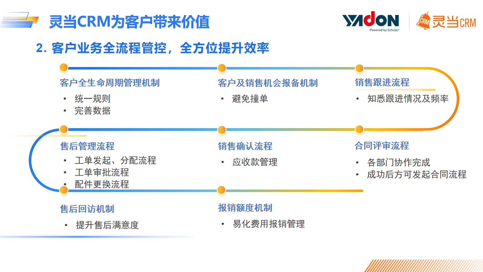 灵当crm可实现从销售行为管理到实现整个销售业务的管理,通过对客户业务全流程的管控,全方位提升效率。