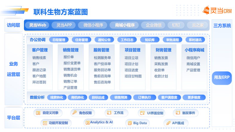 作为同样在领域内深耕的CRM厂商-灵当CRM,凭借丰富的行业经验与专业的实施服务,成为了联科生物的数字化赋能伙伴,基于自身的实践经验,双方进行了友好合作,灵当CRM的专业服务团队为联科生物搭建起了以客户中心的全业务流程数字化管理。