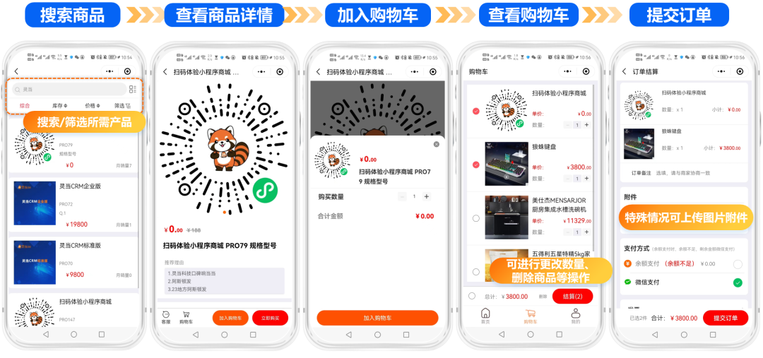 客户、经销商快速下单!客户可通过多种途径(扫描二维码/小程序分享/微信搜索/微信公众号服务等)进入小程序商城,选择商品,提交订单。付款方式目前可选择线上支付或保留线下对公付款,契合B2C、B2B业务需求。