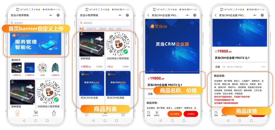 商城界面自定义设置!首页轮播图、商品列表、商品详情、优惠政策等内容只需在灵当CRM中自定义设置,小程序商城即可完美呈现。