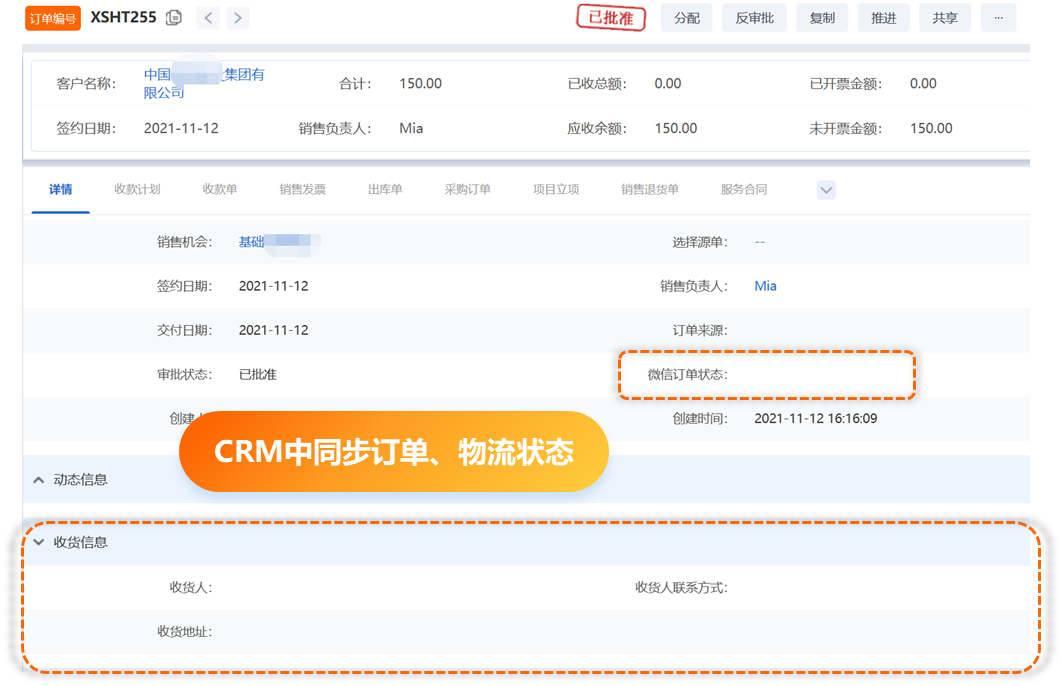 订单自动传至CRM,方便跟踪!客户在小程序商城下单后,订单信息自动传输到CRM【销售订单】模块,收款开票、物流发货、售后服务等都可在CRM中推进,实现数据互通。