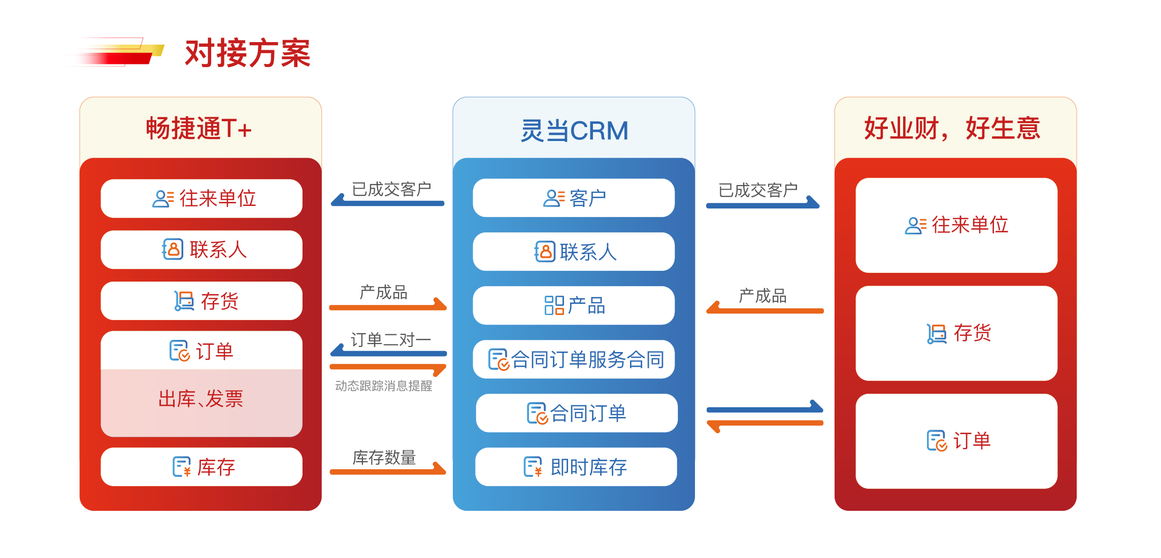 2024年,灵当CRM继续与畅捷通结伴同行,共探企业数字化转型发展之道。目前,灵当CRM已实现与畅捷通T+、T+Cloud、好业财等多条产品线的深度集成,让多维度信息实现实时同步与交互。无论是基础资料的共享,还是售前咨询到售后服务的全流程记录,系统都能实现高效对接,提升业务流转效率。