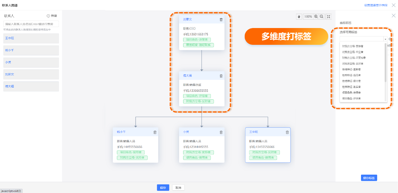 此外,为了进一步识别联系人特征,我们可以从项目角色、性格特征、对我方立场、覆盖程度等维度给联系人打上标签。