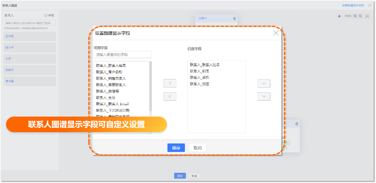 联系人图谱中的卡片信息也支持自定义设置,可便捷添加、删减、调整字段顺序。