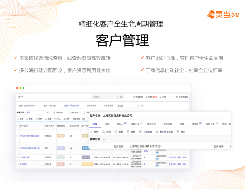 以灵当CRM为例,在客户管理板块,CRM软件有以下几大核心功能: