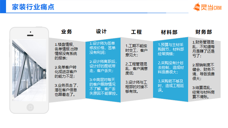 灵当CRM装饰行业解决方案是以项目为中心的全流程信息化管理平台,帮助企业全面提升信息化管理水平,提高工作效率,其主要特点有: